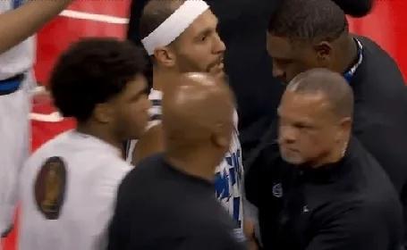 在第二节比赛进行到还剩26.6秒时,德拉蒙德与卡特在卡位时互相推搡发生肢体冲突,并且两人也是对喷吵起来。随后萨格斯和沃克也加入,贝恩也参与进来。